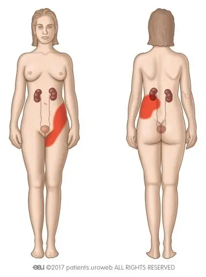 Se o cálculo obstruir fluxo normal de urina através do ureter, causando distensão da cápsula do rim e das paredes do ureter, você sentirá uma dor intensa, conhecida como cólica renal. A dor típica de cólica renal cresce e diminui de intensidade e evolui em ondas (paroxismos), surge repentinamente e não diminui se você mudar de posição. Esses paroxismos geralmente duram 20-60 minutos. Essa dor aguda é percebida na região lombar e no flanco (na lateral do abdômen, das costelas ao quadril). Se o cálculo estiver na parte mais baixa do ureter, você poderá sentir dor na virilha, nos genitais (testículos e grandes lábios) e sintomas urinários que se assemelham a infecção urinária (como ardência, urgência e aumento da frequência miccional). A cólica renal é frequentemente acompanhada de náuseas e vômitos.