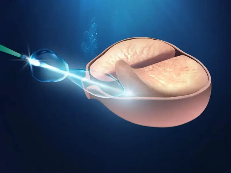 - Enucleação: Utiliza-se a fibra de laser Holmium para cortar e descolar o tecido hiperplásico da próstata de sua zona periférica.