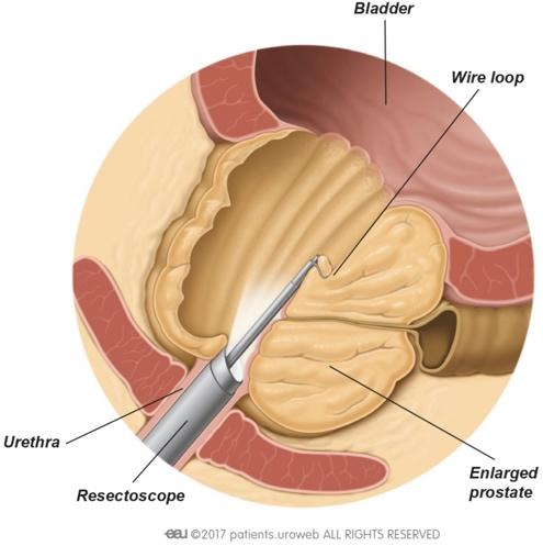 Para realizar RTU-P, você receberá anestesia geral ou raquidiana. Uma vez que você está sob anestesia, é introduzido um ressectoscópio através da uretra para entrar na bexiga. Na ponta desse endoscópio há uma alça de ressecção (tipo um laço de arame) que usa uma corrente elétrica de alta frequência para cortar o tecido da próstata. O ressectoscópio também possui uma câmera que permite a visualização da próstata e bexiga em alta qualidade em um monitor de vídeo.
