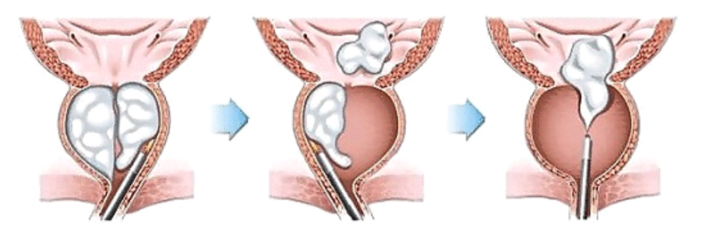 Durante a enucleação a laser, o laser é utilizado para cortar o tecido da próstata e, desta forma, o “miolo” da próstata (zona de tecido hiperplásico) é completamente descolado da parte externa da próstata (zona periférica – onde não há crescimento de tecido hiperplásico). Após, o médico introduz pela uretra um instrumento conhecido como morcelador que fragmenta e aspira todo tecido hiperplásico (todo “miolo” da próstata) que foi descolado da zona periférica da próstata. O tecido retirado é, então, enviado em sua totalidade para análise anátomo-patológica.